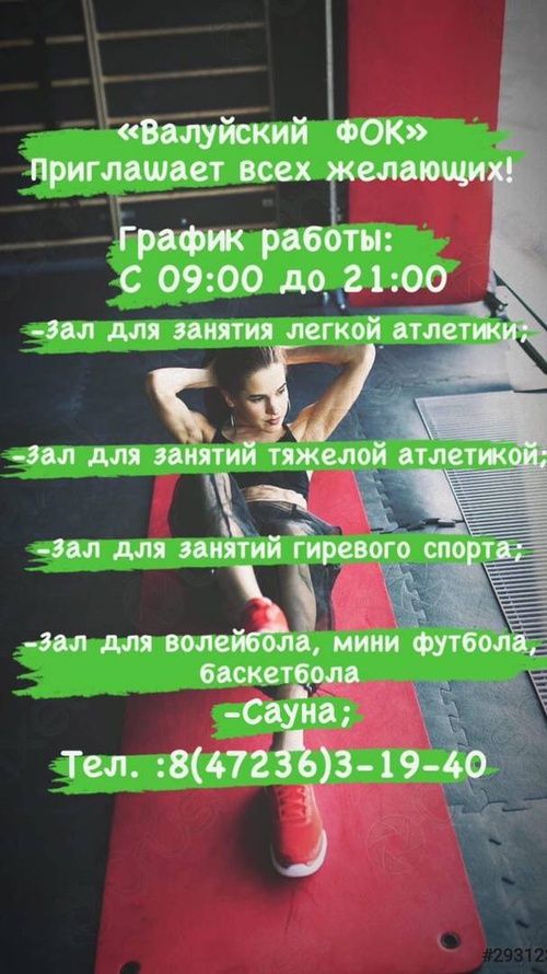 Приглашаем всех желающих посетить Валуйский физкультурно-оздоровительный комплекс. Вы можете позаниматься в тренажерном зале самостоятельно. В спортивном зале доступны игровые виды спорта: футбол, волейбол, баскетбол, гиревой спорт .Для вас возможны варианты как разового посещения, так и оформления абонементов и договоров об аренде.